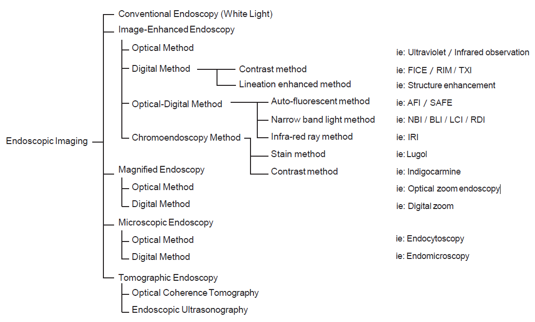 Since the introduction of this classification, several IEE techniques have become commercially available through advances in endoscopy technology, including blue light imaging (BLI), linked color imaging (LCI), red dichromatic imaging (RDI), and texture and color enhancement imaging (TXI). Therefore, a revised version including those techniques is presented in Fig. 1.