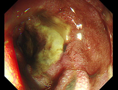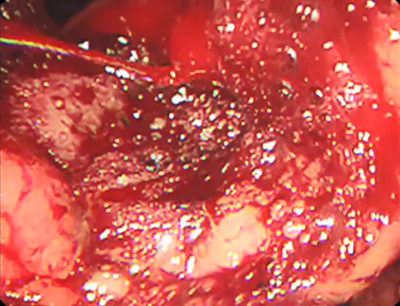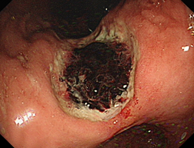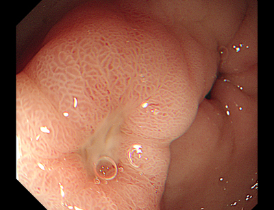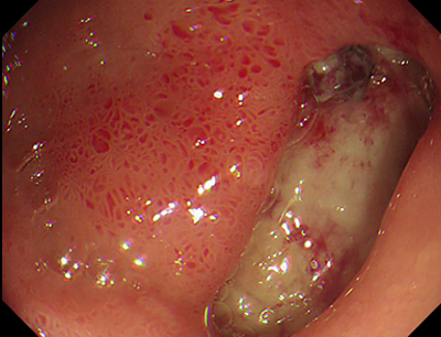 FIIcДрібні тромбовані судини (чорні крапки). Ці крапкі та плями різного кольору повʼязані з низьким ризиком рецидиву кровотечі, однак їх диференціація з тромбованою судиною може бути утруднена. Лікувальної ендоскопії не потрібно.
